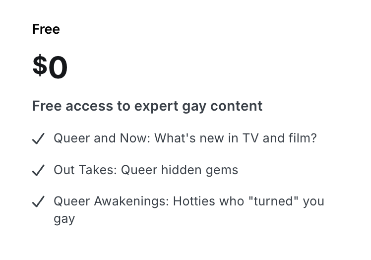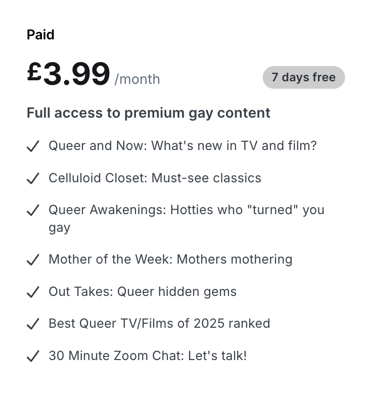 Beyond Friday's free newsletter, you can access a gazillion extras in the paid newsletter every Tuesday. That includes Mother of the Week, queer hidden gems, and the Best LGBTQ+ Movies/Shows of 2026 ranked — plus a 30 minute Zoom chat for all paying readers 🚨.